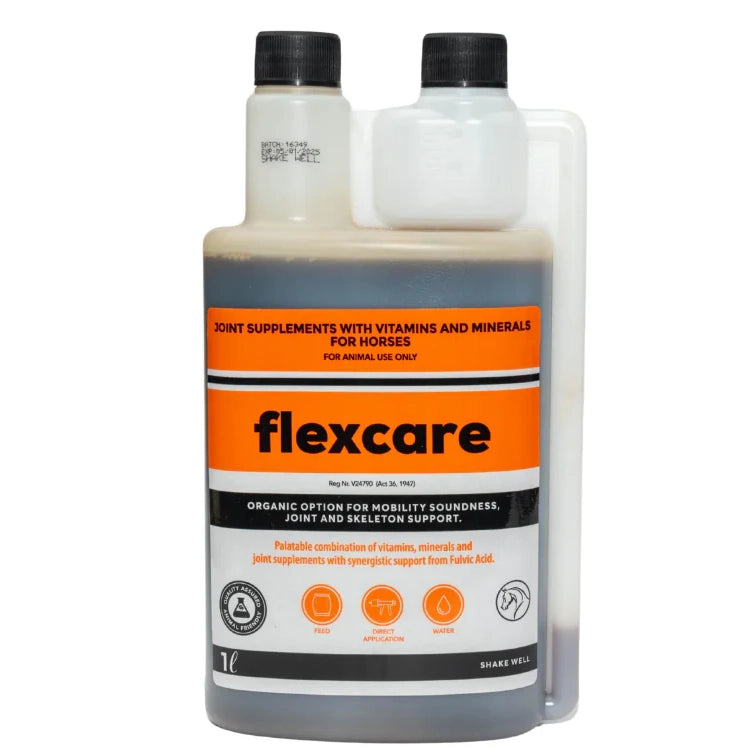 Give your horse the freedom to move with FlexCare Equine – an advanced joint supplement crafted for long-term comfort and peak performance. Packed with MSM, Glucosamine, and Chondroitin, and boosted with Fulvic Acid for enhanced absorption, it delivers results you'll notice with every stride. Whether you're focusing on preventative care or therapeutic relief, FlexCare helps reduce pain, supports joint and skeletal health, and promotes strong, fluid movement – so your horse can thrive during work, rest, and play.