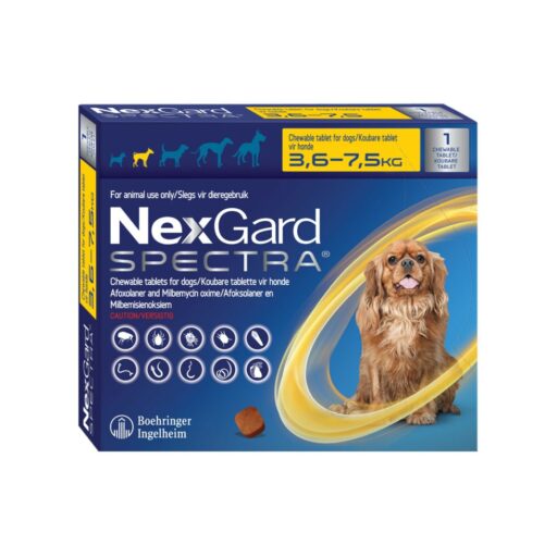 NexGard Spectra is a broad spectrum oral treatment for the prevention and control of flea, tick and mite infestations, prevention and control of adult roundworms, hookworms, whipworms, prevention of heartworm infestations and the establishment of adult Spirocerca lupi in the oesophagus (with reduction of egg shedding) in dogs. Nexgard Spectra contains the active ingredients afoxolaner and milbemycin oxime and is safe for use on puppies from 8 weeks of age, provided they have a minimum weight of 2 kg.